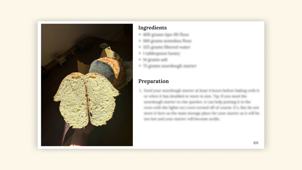 I'm selling an E-Cookbook with many of my dearest and most sought after recipes like slow cooked lamb leg, butter chicken with naan, shio ramen, sourdough bread and sourdough starter guide + recipe, gelatin gummies and many more! Phone and PC version available:)